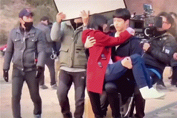 当然,导演组不会被公主抱憋死,抱不起来,就想其他办法呗!这是通过梯子实现的公主抱。