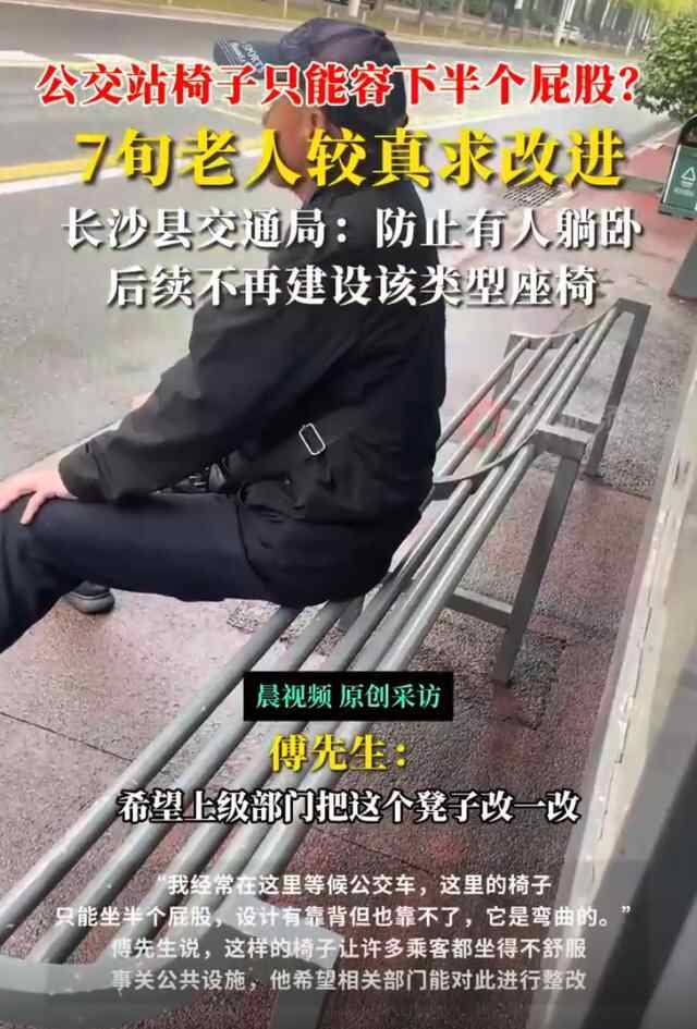 傅先生今年78岁,与老伴住在长沙市内,公交车是他们经常搭乘的交通工具。但每次在长沙黄花国际机场附近等候公交车时,都会被站内的椅子困扰。