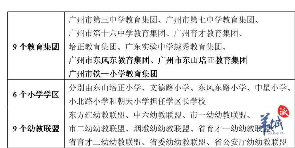 9个教育集团( 广州市第三中学教育集团、广州市第七中学教育集团、广州市第十六中学教育集团、广州育才教育集团、培正教育集团、广东实验中学越秀教育集团、广州市东风东教育集团、广州市东山培正教育集团、广州市铁一小学教育集团)