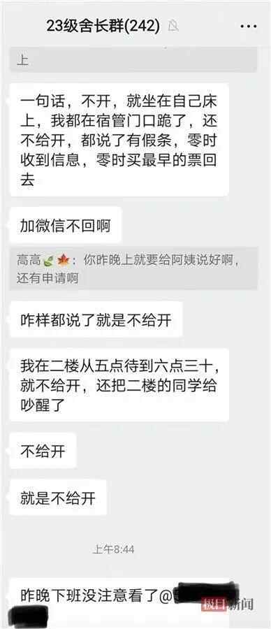 当天上午8时许,该学生在群内表示,其在二楼(宿管值班室)从5时待到6时30分,宿管就是不给开门,“飞机没赶上,最后一面没见上”。