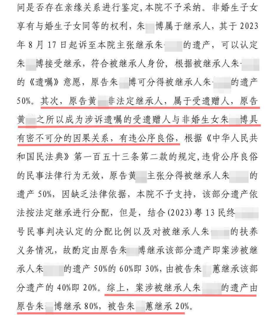 在遗产分配上,法院提到,民法典规定非婚生子女享有与婚生子女同等权利,根据朱某遗嘱意愿,朱某博可以分得遗产的50%。而“黄某之所以成为涉诉遗嘱的受遗赠人与非婚生女朱某博具有密不可分的因果关系,有违公序良俗”,法院认定该部分遗产应按法定继承进行分配,结合扶养义务情况,该部分朱某博继承60%,朱某蕙继承40%。综合下来,朱某博继承朱某遗产的80%,朱某蕙继承20%。