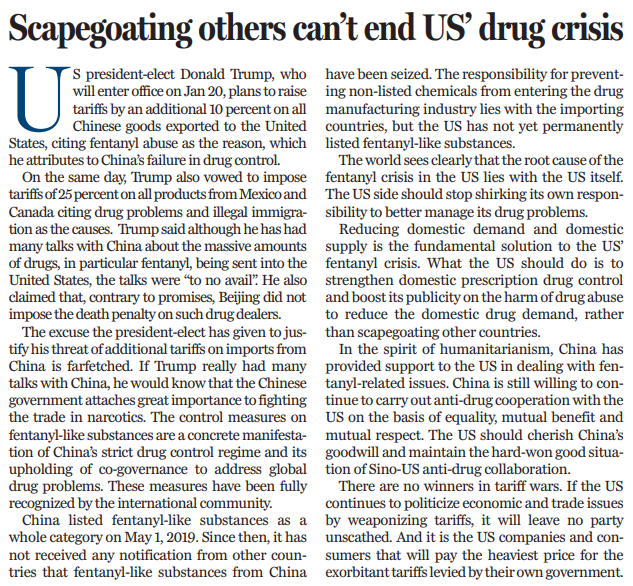 与此相反,美国至今仍未永久列管芬太尼类物质,这是对美国民众极不负责任的行为。全世界清楚地看到,美国内芬太尼危机的根源在于自身,减少国内需求和国内供给才是治本之策。美方要做的是反躬自省,加强国内处方药管控,强化对毒品危害宣传,减少国内毒品需求,而不是对别国污蔑抹黑、甩锅推责。
