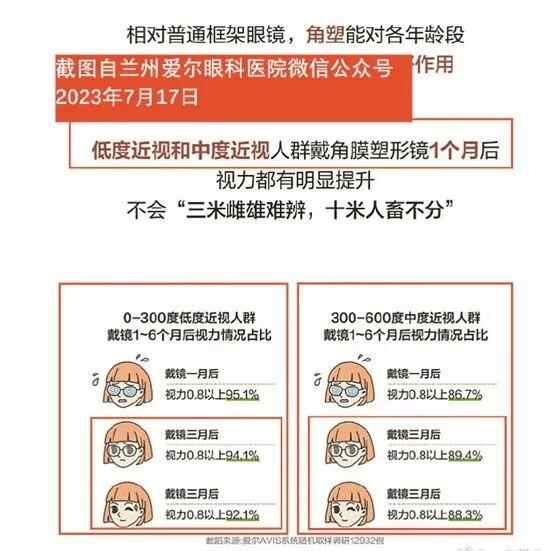 “……视力可提升至0.8及以上……”韩建质疑,这些“关键数据”体现了角膜塑形镜的“有效率”。根据广告法,医疗、药品、医疗器械广告不得含有说明治愈率或者有效率的内容。