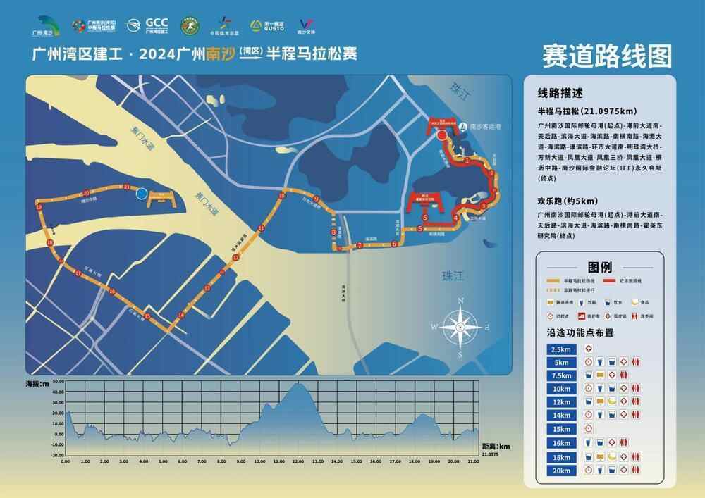 本次南沙马拉松的起点设在广州南沙国际邮轮母港,由南沙湾一路向南奔跑。起跑人群密集,需注意脚下,缓慢加速。出发450米直道后,进入“S”型弯道,0.8公里后,路面由4车道收窄至2车道,请放缓步伐,享受天后路的历史脉搏。2公里后 ,来到天后宫牌坊,这里有一望无际的大海,湿润的空气中弥漫着海风的味道,可以尽情享受海浪与船只协奏的交响乐曲。2.3公里后来到海滨大道,滨海公园绿植繁茂,生机勃勃,山海相间,崭新而又平坦的柏油路,舒适且惬意。2.5公里处经过第一个医疗站,适时调整恢复状态吧。4.5公里处设有半程马拉松和欢乐跑终点分流点,请密切关注沿路的分流指示牌,提前缓慢,确保路线正确。欢乐跑选手在分流点右转后200米抵达霍英东研究院,赛道有终点,欢乐没有终点,完赛奖牌是最好的勋章。