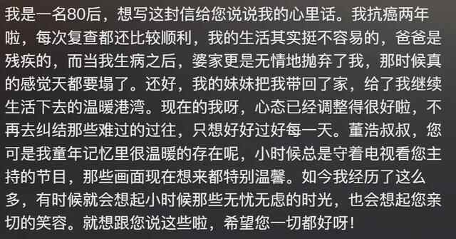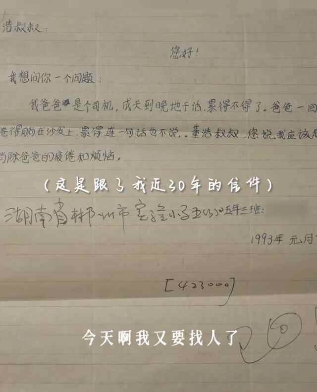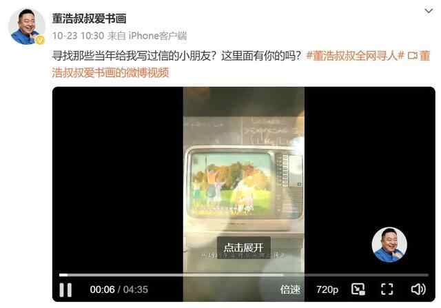10月23日,董浩叔叔在他的社交平台发布一则视频,寻找那些当年给董浩叔叔写过信的小朋友。董浩叔叔说,30年前给我写信的孩子们,你们过得好么,我挺惦记你们的。
