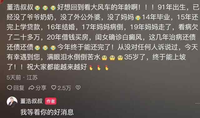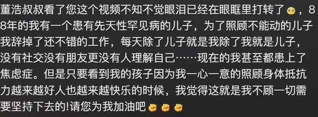 董浩叔叔的视频下面,有很多人留言,大家都在向董浩叔叔倾诉自己的烦恼。很多网友说:“长大一点也不好玩。”“长大太累了。”“我坚持不住了……"