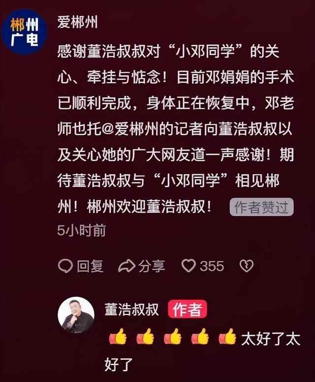 董浩叔叔也发了视频表达对“小邓同学”的关心,郴州电视台在评论区回复,邓娟娟的手术已经顺利完成,身体正在恢复中,期待之后在郴州相见。