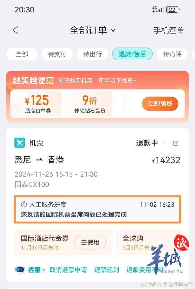 据周先生向记者讲述,2024年11月2日10时24分,他在“去哪儿旅行”APP平台上,帮朋友购买了4张从悉尼飞往香港的机票(起飞时间为11月26日15:15),每张机票票价为3558元(含税及保险),航空公司为国泰航空CX100航班。他通过平台绑定的信用卡支付了全部款项14232元。