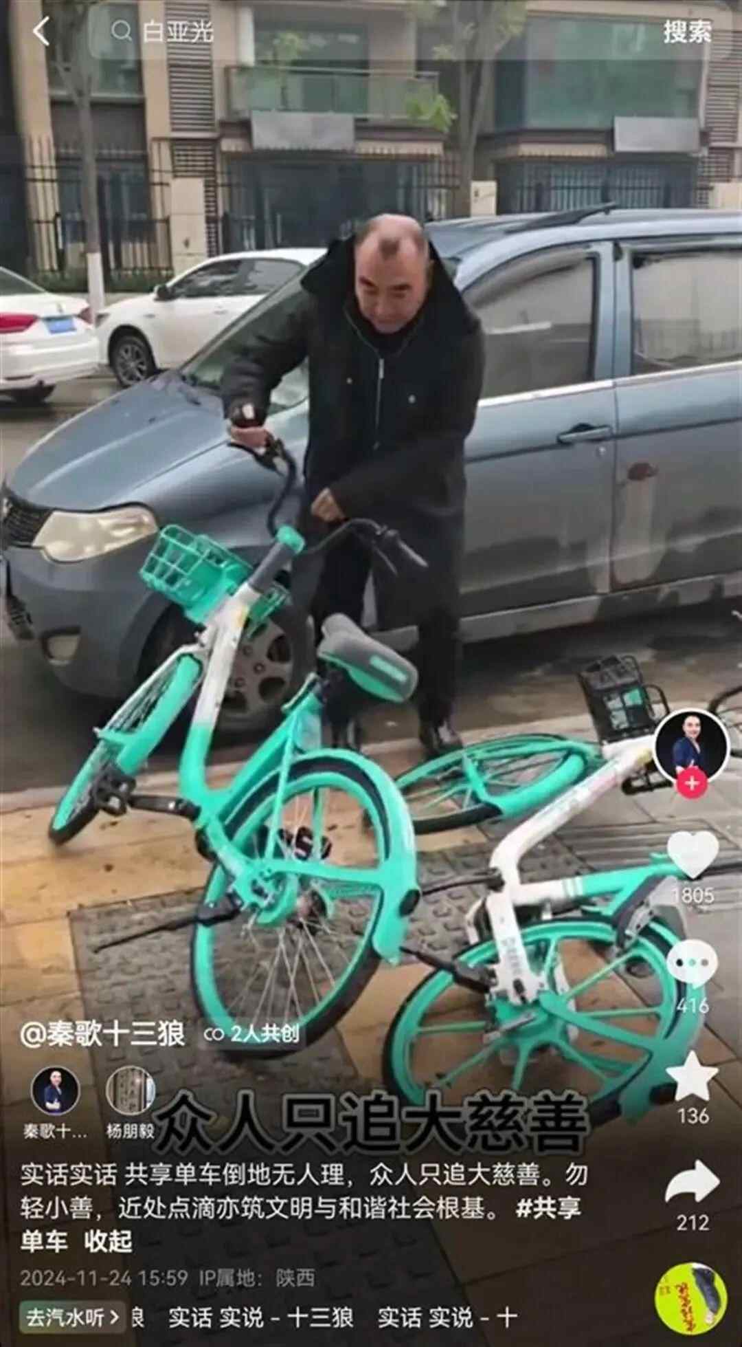 值得注意的是,其社交账号“秦歌十三狼”有17万多粉丝,几天前的11月24日还发表了扶起共享单车的视频,并配文称:实话实说,共享单车倒地无人理,众人只追大慈善。勿轻小善,近处点滴亦筑文明与和谐社会根基。
