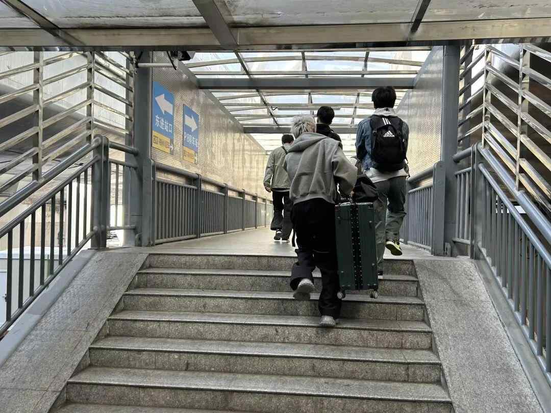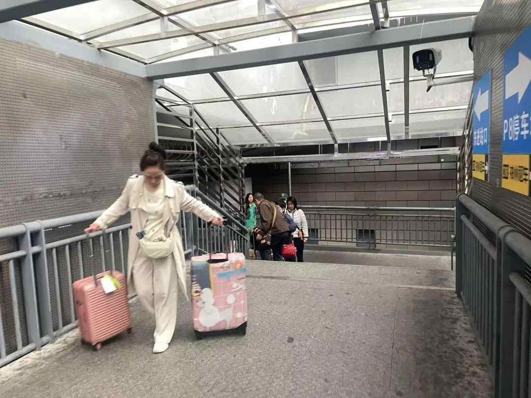 坐扶梯上天桥后还需要走一段台阶,旅客手提行李箱爬楼梯。