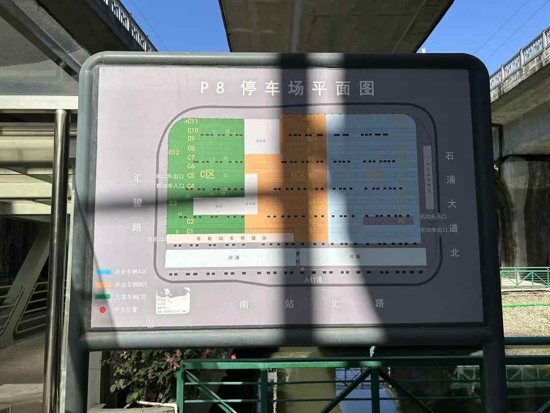 P8停车场C区为旅游大巴停车点,过天桥后需经过B区才能到达C区。