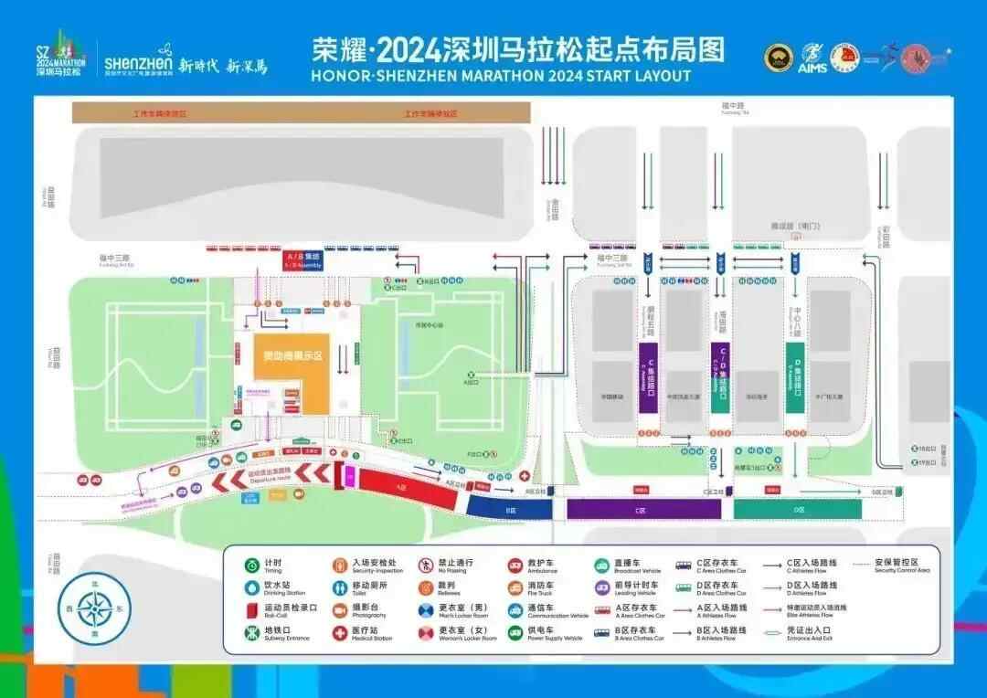 福中三路(彩田路-益田路段,东西双方向)、金田路(福中路-福华一路段,南北双方向)、彩田路(福中路-深南大道,北往南方向)、鹏程五路(福中路-深南大道段,南北双方向)、海田路(福中路-深南大道段,南北双方向)、中心八路(福中三路-深南大道段,南北双方向)实行临时管制交通管理措施(搭建马拉松赛事起点相关设施)。