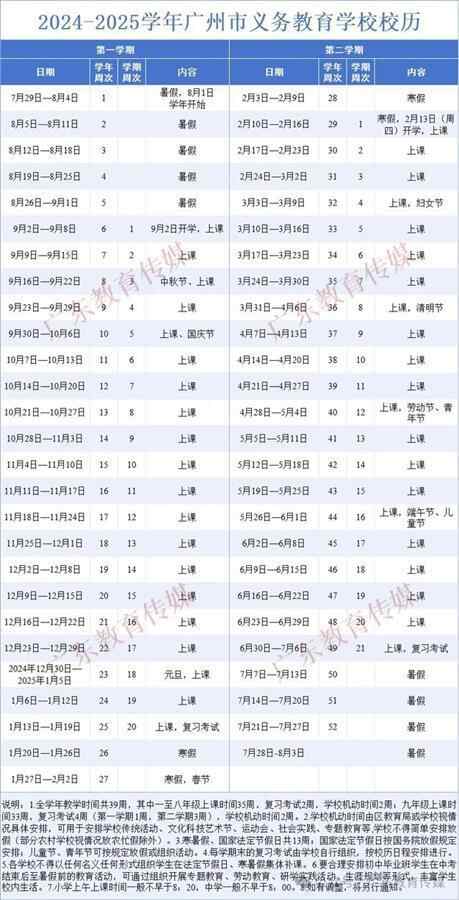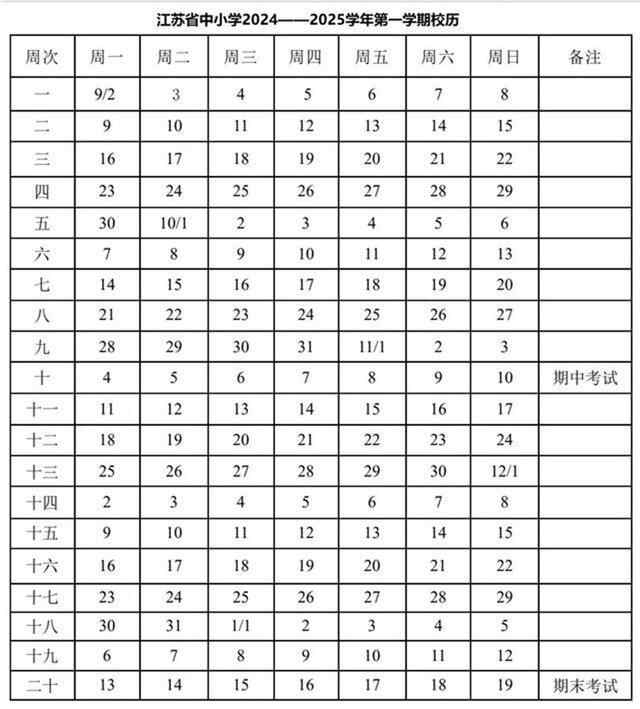 义务教育阶段:2024年9月1日(星期日)开学;2025年1月11日(星期六)结束本学期工作,共19周;2025年1月12日(星期日)至2月16日(星期日)放寒假,共5周零1天。