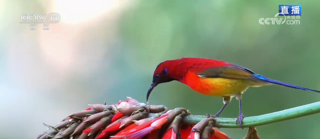 根据专家介绍,高黎贡山的鸟类“垂直迁徙”一般是从每年的11月开始,在12月底达到最高峰。这段时间“垂直迁徙”的鸟类正在陆续增多,通过蹲点拍摄,我们也十分幸运地在目前所处的中低海拔位置捕捉到了它们的身影。您看,尾羽修长拉风,呈现火红色,浑身色彩明艳的这种小鸟叫做火尾太阳鸟;身材小巧玲珑、通体金黄色的则是金色林鸲;而头戴“黑色小帽子”,翅膀披上“蓝灰色外套”的就是黑顶噪鹛了,它们都是从海拔3000米左右垂直迁徙下来的鸟类。可以发现,由于高黎贡山森林密布,在这里生活的鸟类70%以上都是体型相对娇小的鸣禽,比如柳莺这种鸟身长只有6厘米左右。这便于它们在密林间快速飞行,同时用歌声和叫声传递族群信息。