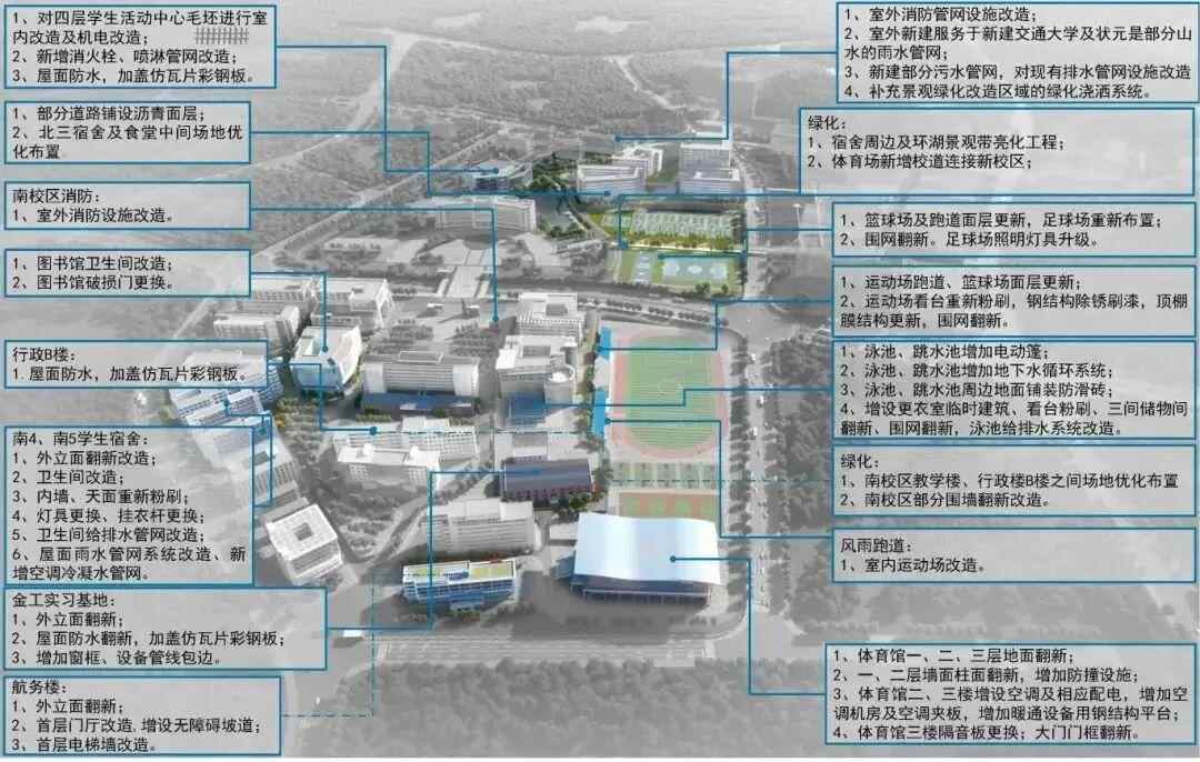 此外,老校区体育场馆、游泳池全面升级改造,教学楼、实验实习车间将焕发新颜,北区学生活动中心将装修一新。