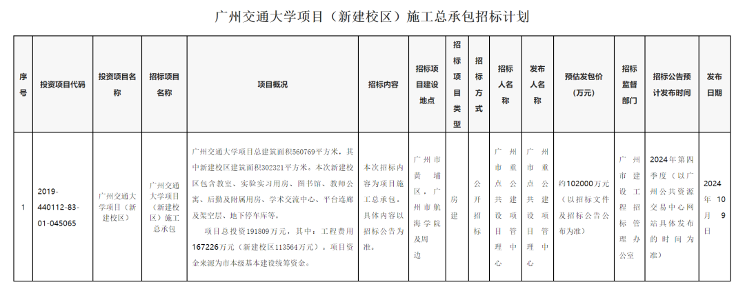 今年10月,广州市重点公共建设项目管理中心发布了广州交通大学项目(新建校区)施工总承包招标计划。这也意味着,谋划多年的广州交通大学新校区要来了。