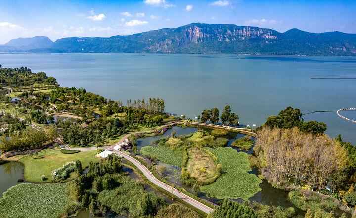 这是2024年10月18日拍摄的云南省昆明市滇池及星海半岛湿地公园(无人机照片)。 新华社记者 陈欣波 摄