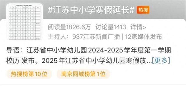 此外,江苏20多所高校近日也公布了寒假时间,将从2025年1月11日起陆续开启寒假模式,其中,高校最长寒假时间长达43天,最短的有26天。