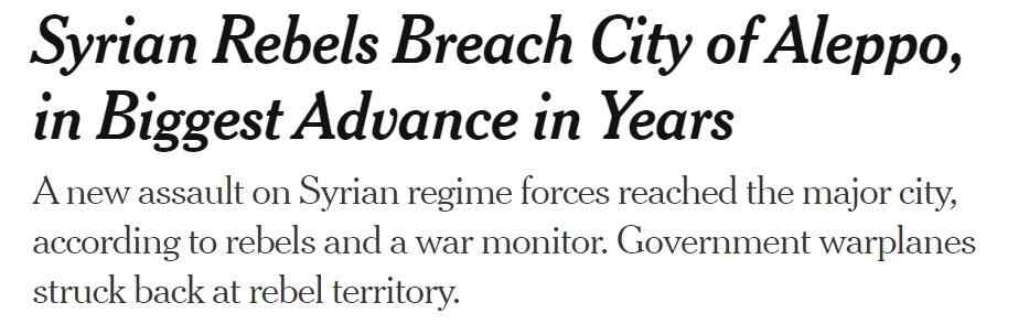 叙利亚军方11月30日发表声明称,叙反对派武装当天已进入叙北部城市阿勒颇大部分地区,并称叙政府军将重新部署予以反击。