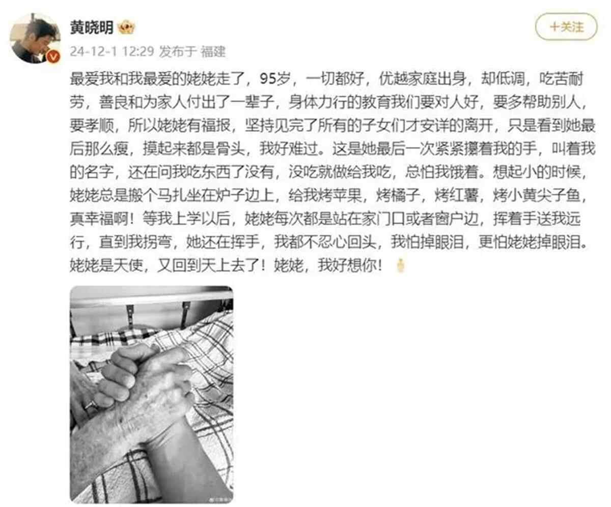 12月1日中午,演员黄晓明悲痛发文,悼念95岁的姥姥去世,并配上两人最后一次握手的黑白图片。