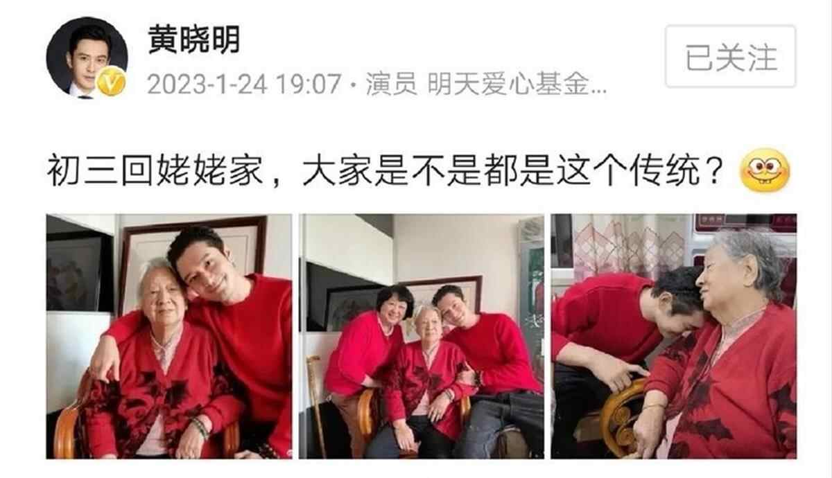 2023年春节,黄晓明回家看望了姥姥,晒出的合影当中,黄晓明和姥姥一身红衣,状态不错。配文写道:初三回姥姥家,大家是不是都是这个传统?