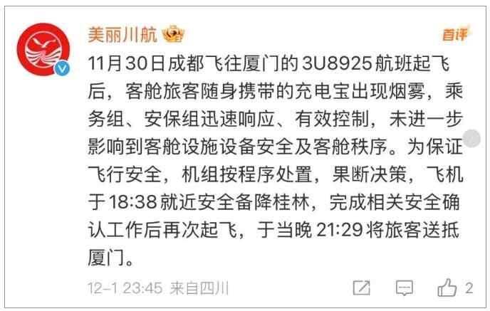 12月1日,@美丽川航 官方账号留言回复:“11月30日成都飞往厦门的3U8925航班起飞后, 客舱旅客随身携带的充电宝出现烟雾 ,乘务组、安保组迅速响应、有效控制, 未进一步影响到客舱设施设备安全及客舱秩序。 为保证飞行安全,机组按程序处置,果断决策,飞机于18:38就近安全备降桂林,完成相关安全确认工作后再次起飞,于当晚21:29将旅客送抵厦门。”