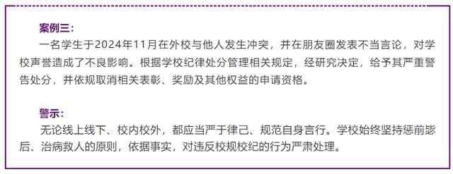 记者注意到,此次共通报了三个案例,其中的案例三称,一名学生在外校与他人发生冲突,并在朋友圈发表不当言论,对学校声誉造成了不良影响。根据学校纪律处分管理相关规定,经研究决定,给予其严重警告处分,并依规取消相关表彰、奖励及其他权益的申请资格。