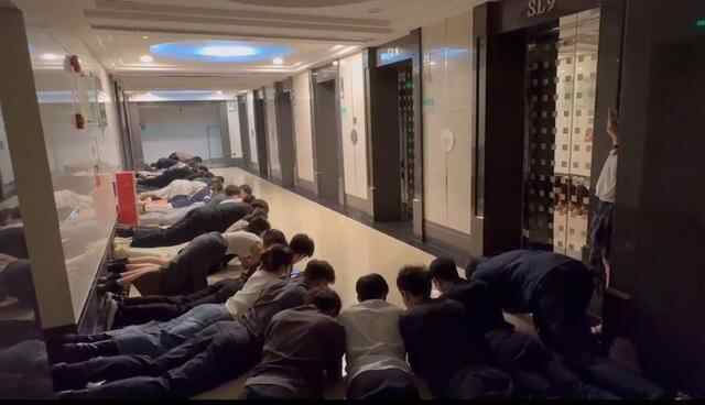 根据网传视频显示,几十个人趴在地上对着电梯口齐声喊道:“启铭分校,欢迎黄总。启铭分校,生死不辱使命,用更好的结果,欢迎黄总的到来。”