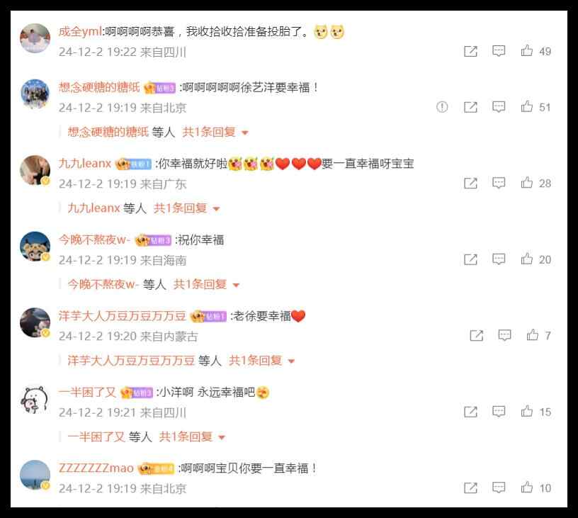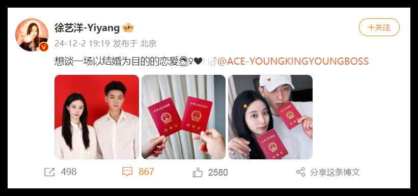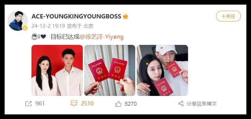 2024年12月2日19时19分,黄子韬、徐艺洋微博同一时间发文官宣领证结婚。黄子韬称目标已达成,徐艺洋:想谈一场以结婚为目的的恋爱。