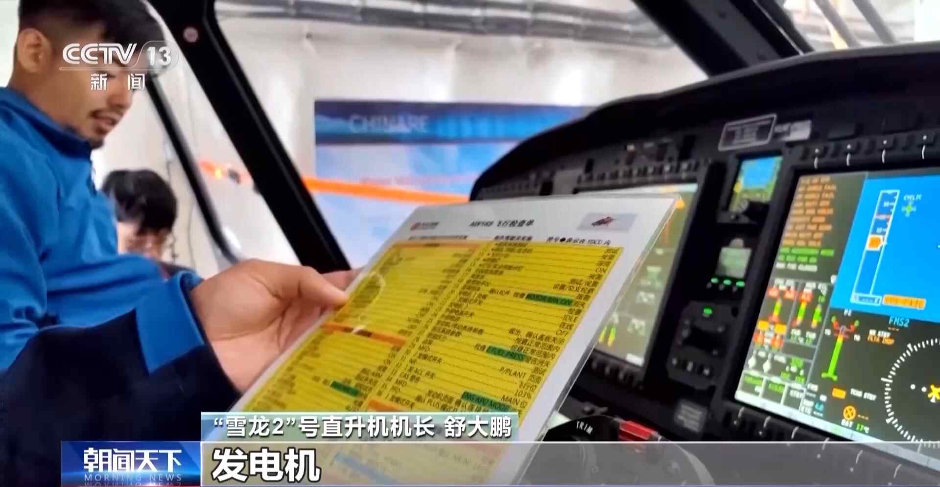“雪龙2”号直升机机长 舒大鹏:保险电门,旋翼刹车,发电机,把所有的通电设备供上电,看看工作情况。咱们这架直升机主要是人员的摆渡运输,还有一些货物要上站。目前整个飞机的状态都是良好的。