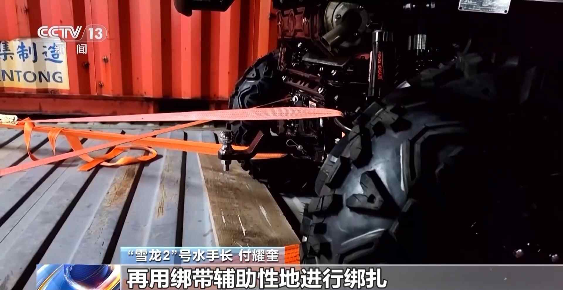 “雪龙2”号水手长 付耀奎:塞上塞子,防止车辆前后跑。重的车我们会用链条加固,两边各两根,再用绑带辅助性地进行绑扎。每天我们都会巡视。