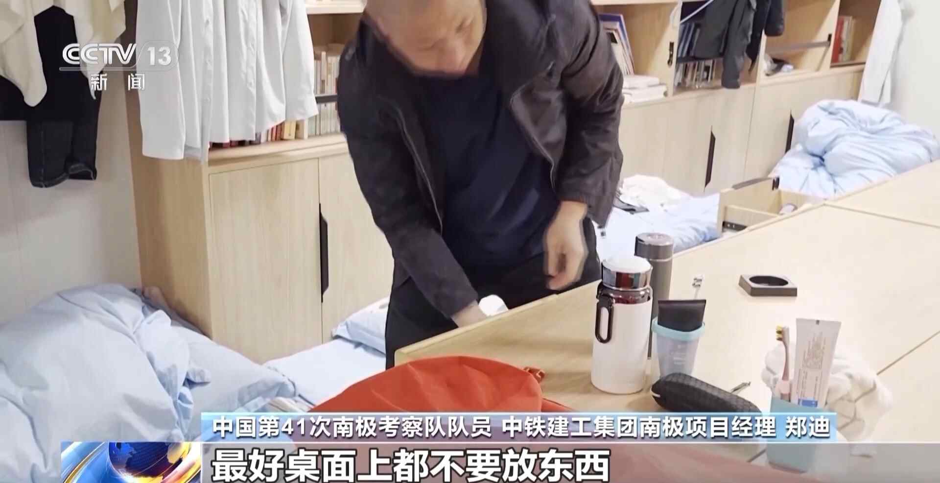 中国第41次南极考察队队员 中铁建工集团南极项目经理 郑迪:最好桌面上都不要放东西,都放在抽屉里。如果浪比较大的话,还是有一些危险,怕砸到人。