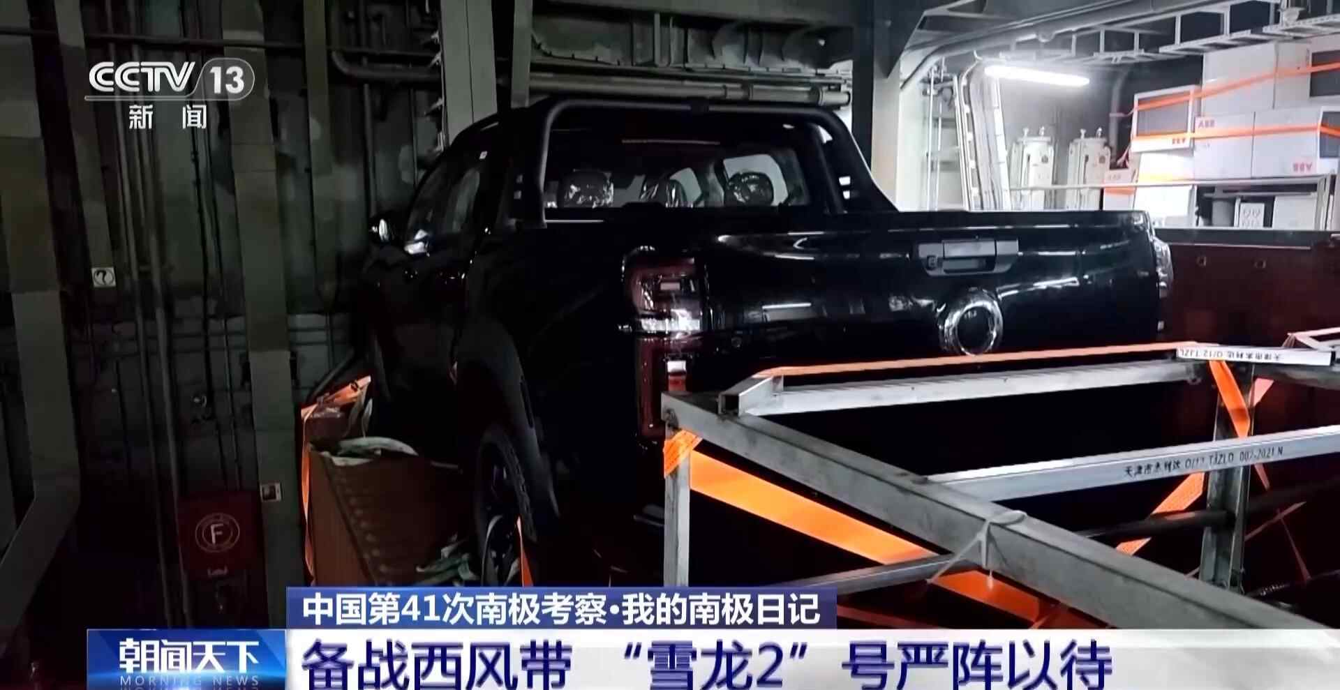 进入“雪龙2”的货仓,爬上集装箱顶,能看到一辆皮卡、两辆雪地摩托车,还有一辆雪地车,都用绑带和链条牢牢锁死,这些车辆将用于秦岭站的人员和货物运输。