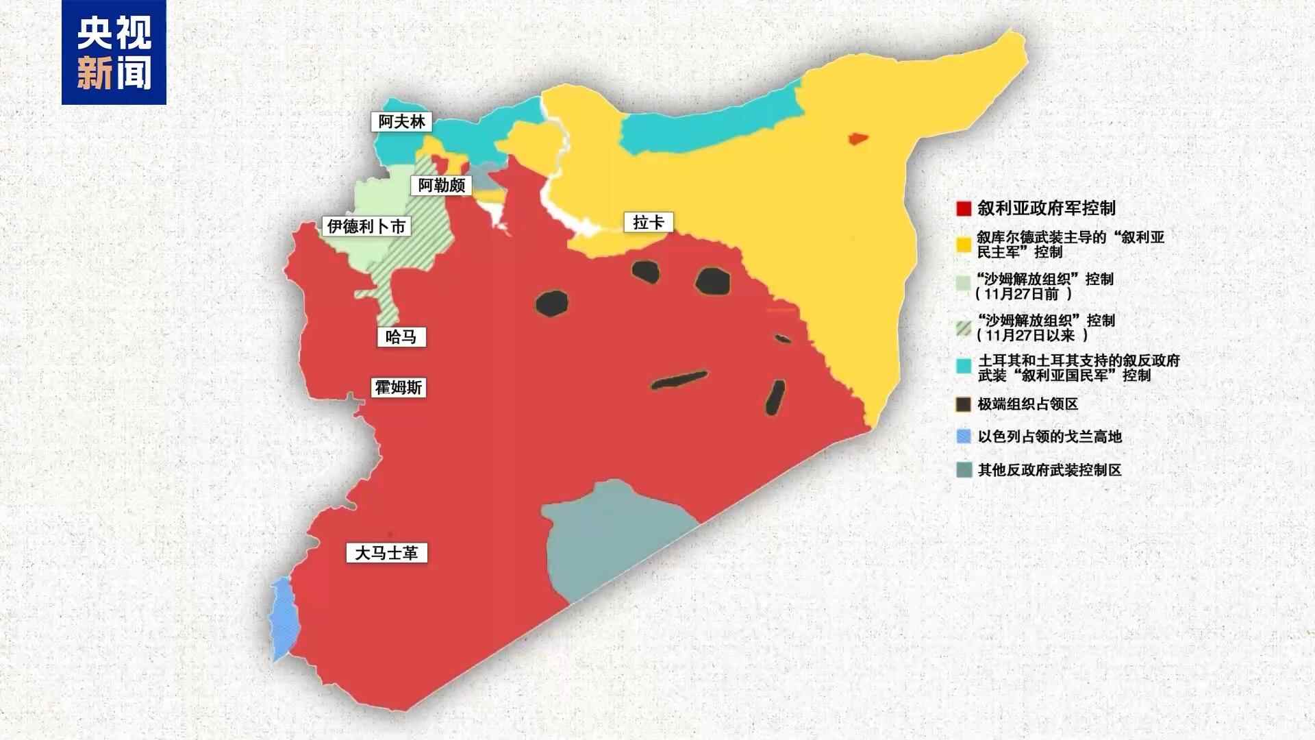 截至12月1日,叙利亚政府军控制着叙绝大多数领土,包括首都大马士革、重要城市霍姆斯,以及目前正在与反政府武装激烈争夺的哈马省。