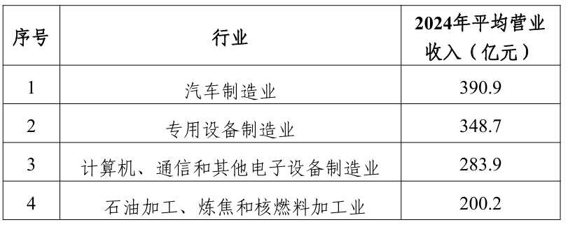 除上述六个行业之外,仪器仪表制造业的企业平均营业收入(51.9亿元)在50亿至100亿元之间;橡胶和塑料制品业、有色金属冶炼和压延加工业等17个行业的企业平均营业收入均不足50亿元,其中,最低的三个行业分别为纺织业(14.2亿元),文教、工美、体育和娱乐用品制造业(12.2亿元),化学纤维制造业(7.3亿元)。