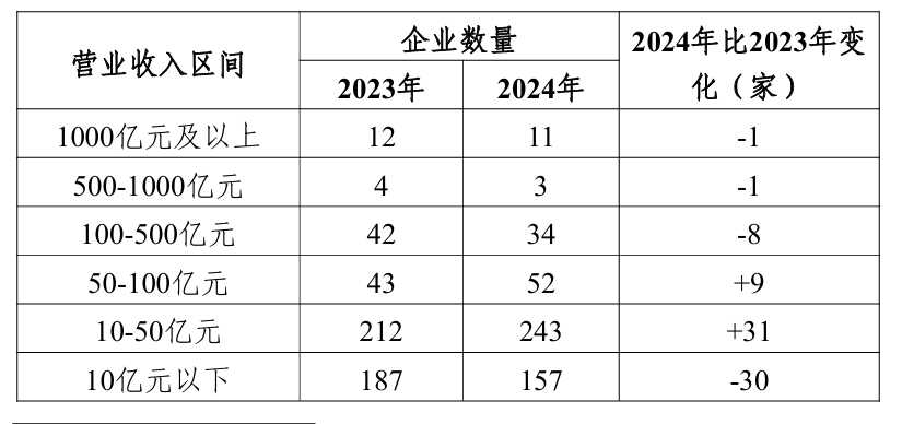 广东制造业领头羊表现如何?暨南大学产业经济研究院院长陶锋在现场发布的《2024年广东省制造业500强企业研究报告》(以下简称《报告》)数据显示,超过1000亿元的企业有11家,500亿至1000亿元之间的企业有3家,100亿至500亿元的企业有34家,50亿至100亿元的企业有52家,10亿至50亿元的企业有243家,10亿元以下企业157家。