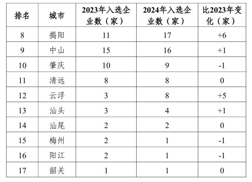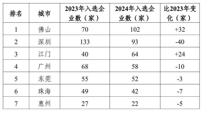 “由于部分企业并未进行申报,报告在研究分析过程中难以获取此类未申报企业的经营数据,故该部分企业及所在地市的统计数据会有缺失。”陶锋说,对比上年,2024年广东制造业500强入选企业数量增加、不变、减少的城市分别为6个、3个、8个,佛山的入选企业数量增加最多,增加32家,也可看到地域分布失衡状态依然存在。