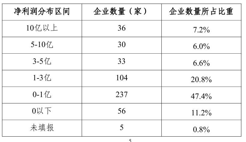从经济效益来看,500强中,盈利企业数为440家、亏损企业56家、未填报企业4家,盈利企业占比88%,前100强的净利润总额为3017.7亿元,占500强企业净利润总额的90.37%。其中,净利润超过10亿元的制造业500强企业有36家,5亿至10亿元之间的有30家,3亿至5亿元之间的有33家,1亿至3亿元之间的有104家。