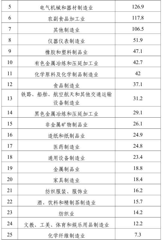除上述六个行业之外,仪器仪表制造业的企业平均营业收入(51.9亿元)在50亿至100亿元之间;橡胶和塑料制品业、有色金属冶炼和压延加工业等17个行业的企业平均营业收入均不足50亿元,其中,最低的三个行业分别为纺织业(14.2亿元),文教、工美、体育和娱乐用品制造业(12.2亿元),化学纤维制造业(7.3亿元)。