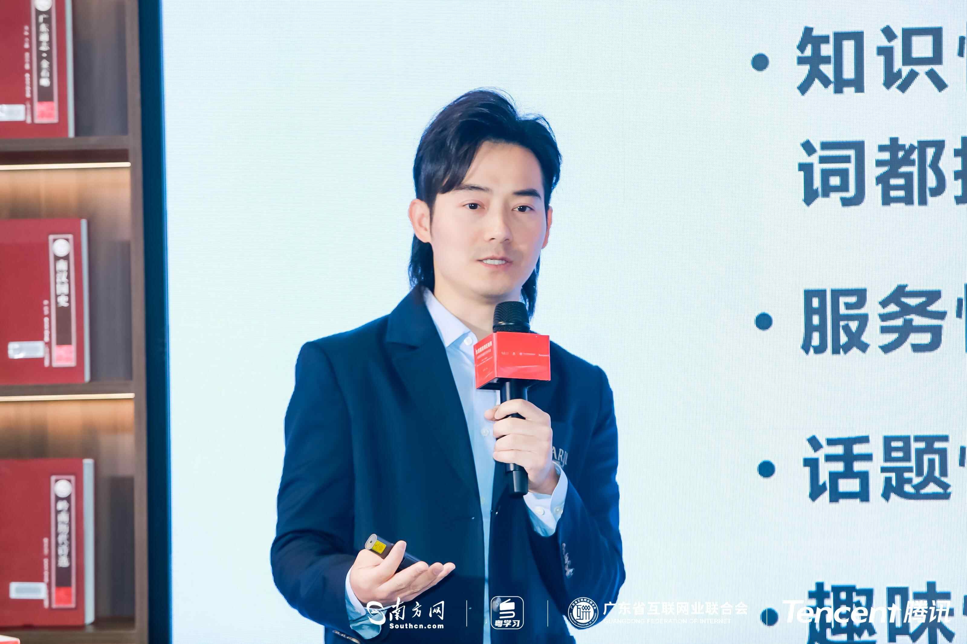 广府文化推广大使、百万粉丝IP“张弛有道粤语读诗”主理人张弛分享了他从用户画像出发,如何让视频与粉丝产生情感共鸣和社会链接。张弛以一个“生”字举例,指出有些广州的中小学生不知道为何该字在粤语上有不同发音,引出粤语的读书音和口语音专业性知识,推出短视频《广州中小学生必须要学粤语》,号召广州中小学生学粤语,引起在广州土生土长的本地人以及在穗外地人的共鸣,视频收获2000万播放量。