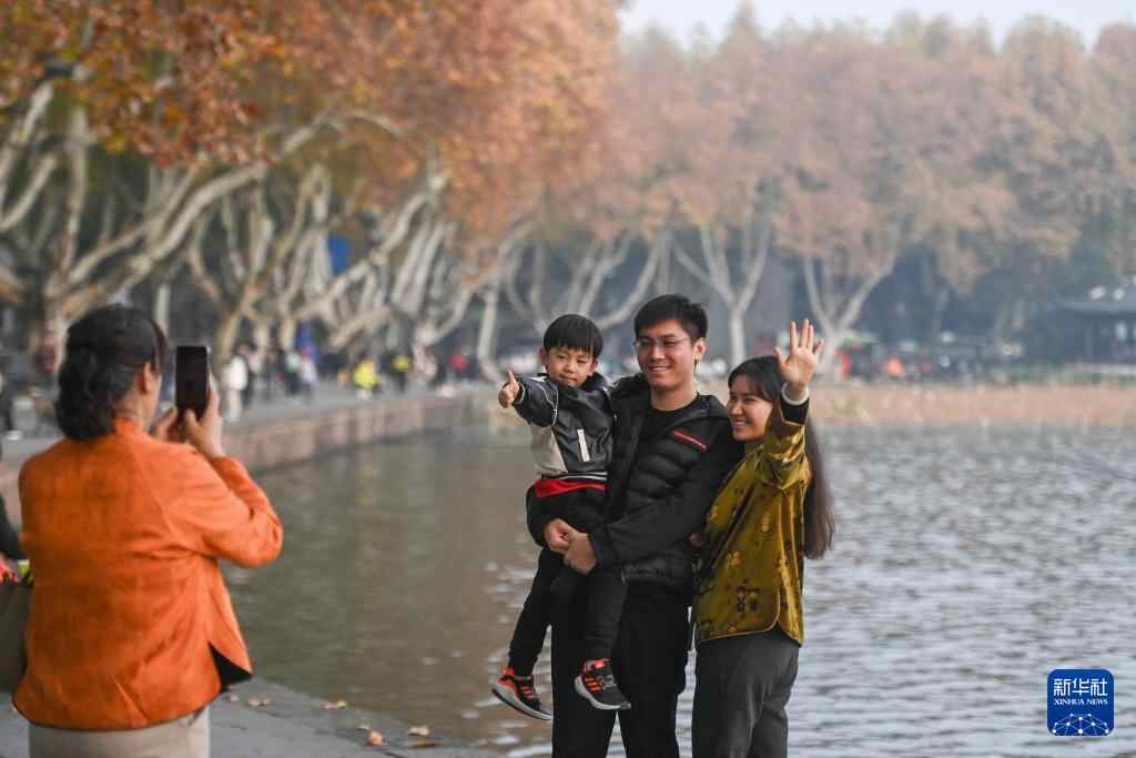 12月3日,游客在杭州西湖景区留影。