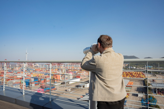 记者们站在观景平台,通过望远镜亲眼见证了全球最繁忙集装箱港口之一的现代化作业,他们争相与壮观的码头场景合影留念。来自哈萨克斯坦《诚实报》社会文化部主任纳乌雷兹别克·萨尔沙耶夫在接受环球网记者采访时说道“宁波舟山港的运作效率和智能化管理令人赞叹,它无疑是全球物流行业的标杆。”