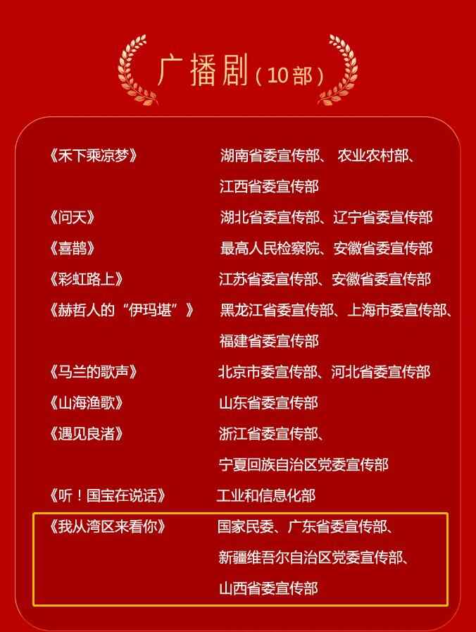 近日,第十七届精神文明建设“五个一工程”优秀作品奖入选作品公布,其中由中共中山市委宣传部参与出品的广播剧《我从湾区来看你》成功入选。