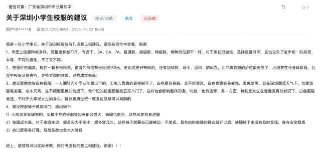 近日,就有家长提出,建议深圳小学生校服降价、修改款式: