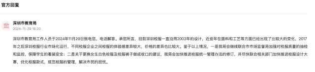 对此,深圳教育局回应表示,将继续联合市市场监督局加强对校服质量的抽检和监控,保障学生的着装安全;同时加快推进校服统一管理办法的修订,联合相关部门加快推进校服设计大赛,优化校服款式。