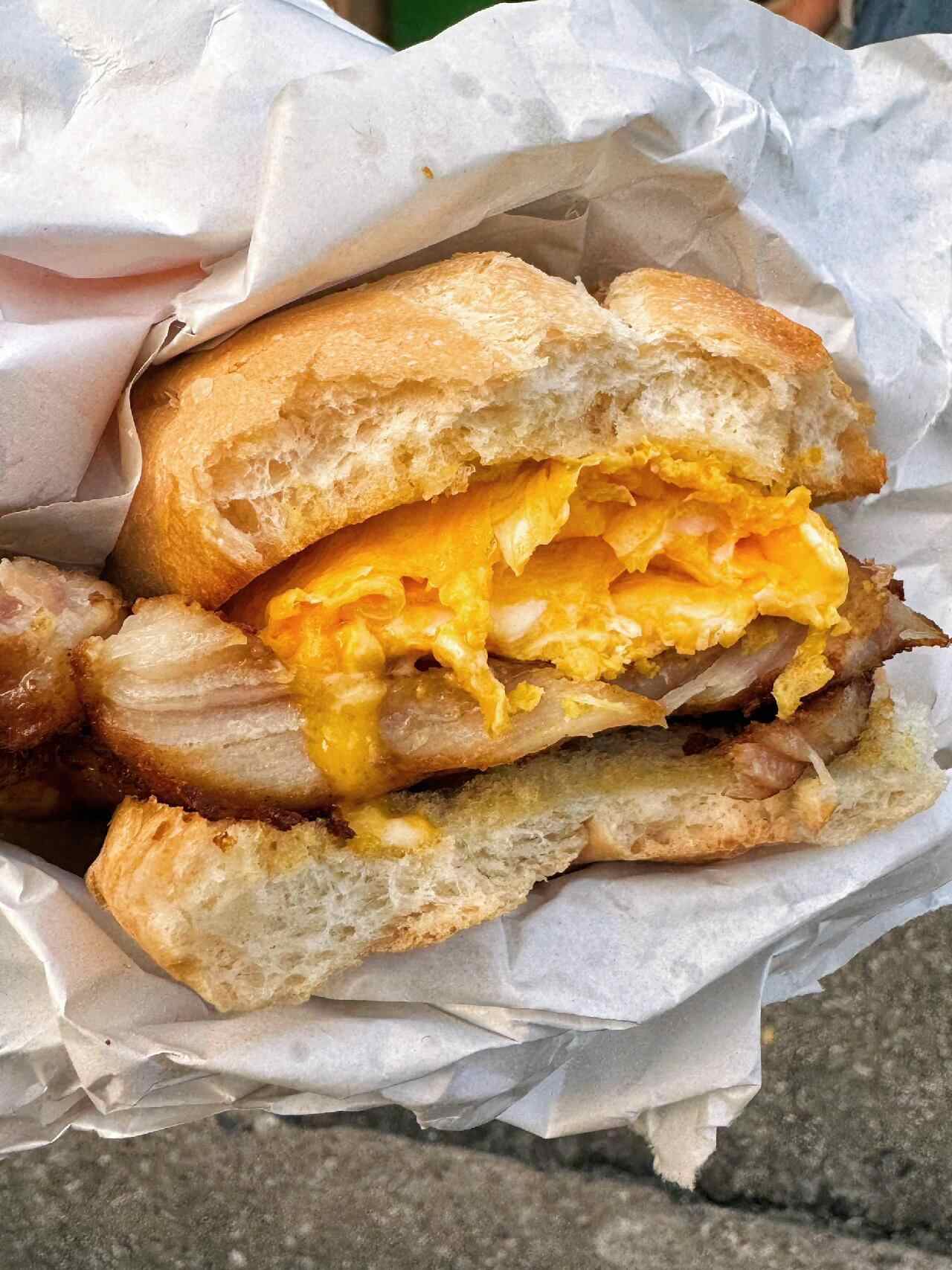 这个看着像汉堡的澳门美食就是猪扒包。大利来记的猪扒包、世记咖啡的厚蛋猪扒包等都很受欢迎~