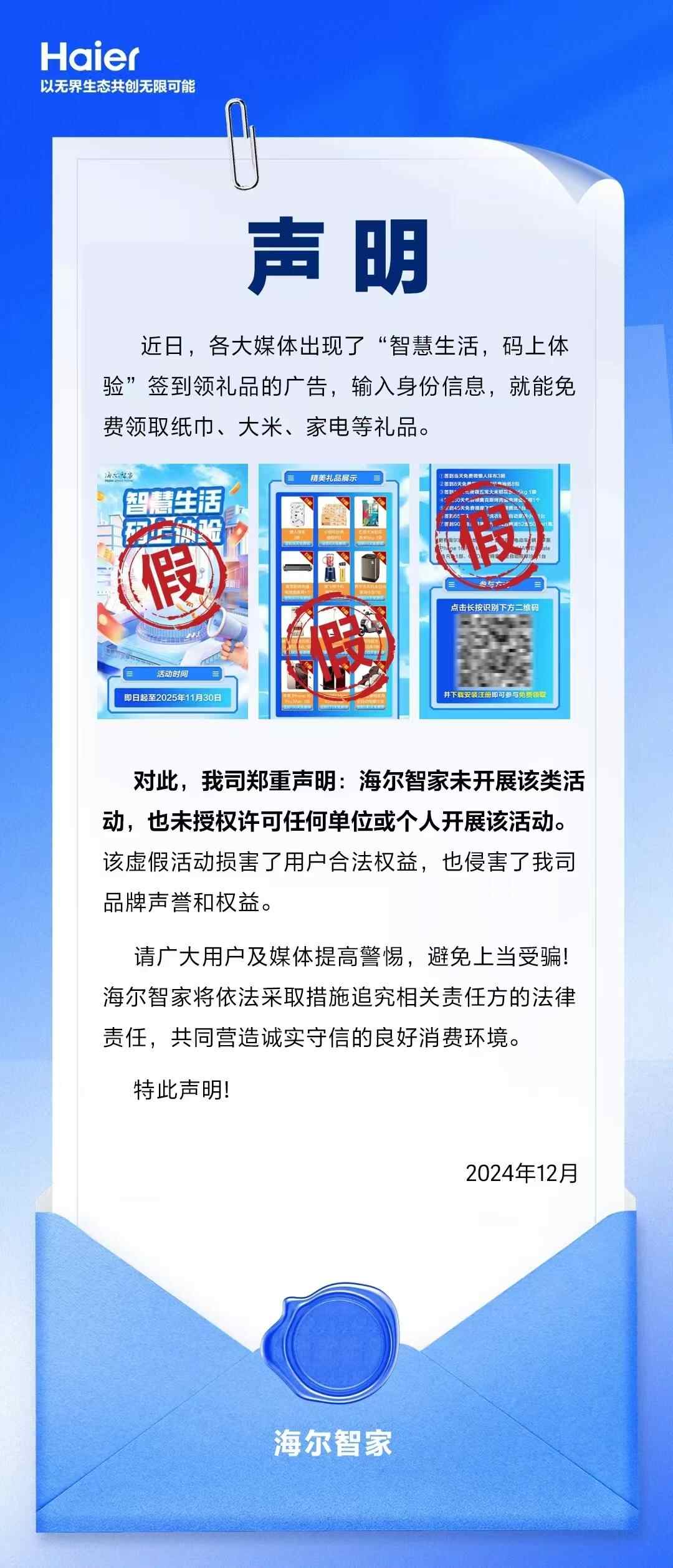 12月4日,海尔智家方面声明称:“海尔智家未开展该类活动,也未授权许可任何单位或个人开展该活动。该虚假活动损害了用户合法权益,也侵害了海尔智家品牌声誉和权益。”