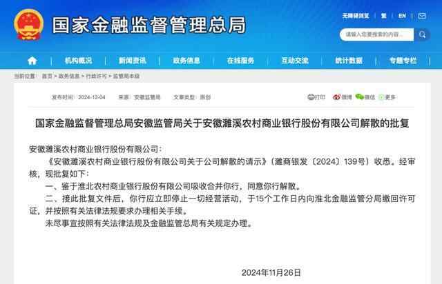 近日,安徽金融监管局指出,接此批复文件后,安徽濉溪农商银行应立即停止一切经营活动,于15个工作日内向淮北金融监管分局缴回许可证,并按照有关法律法规要求办理相关手续。