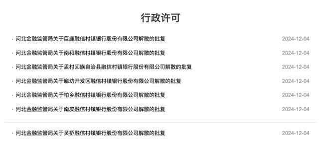 12月4日,金融监管总局官网披露多条行政许可信息。因被吸收合并,7家村镇银行以及1家农商银行均于日前获批解散。