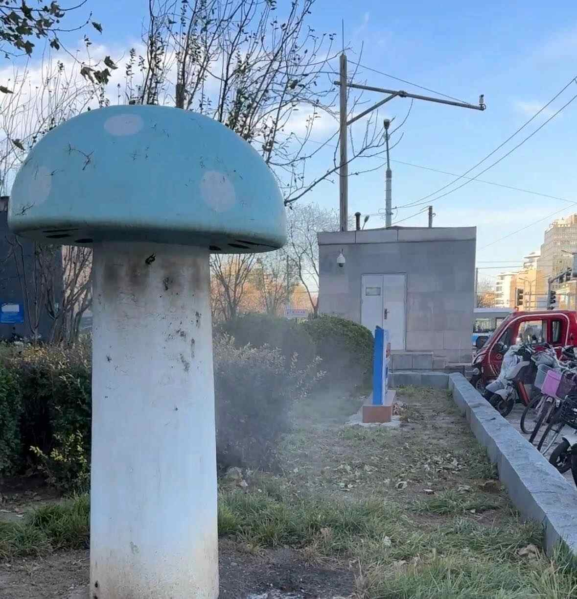 这些“蘑菇”一般“长”在人行道旁的绿化带里,一米到两米高,一到冬天,就会喷出白色雾气。其伞盖大多是蓝绿色,上面有白色的圆斑,造型既复古又童趣。好像小时候见过,有网友称这种不真实的感受为“中式梦核”感。